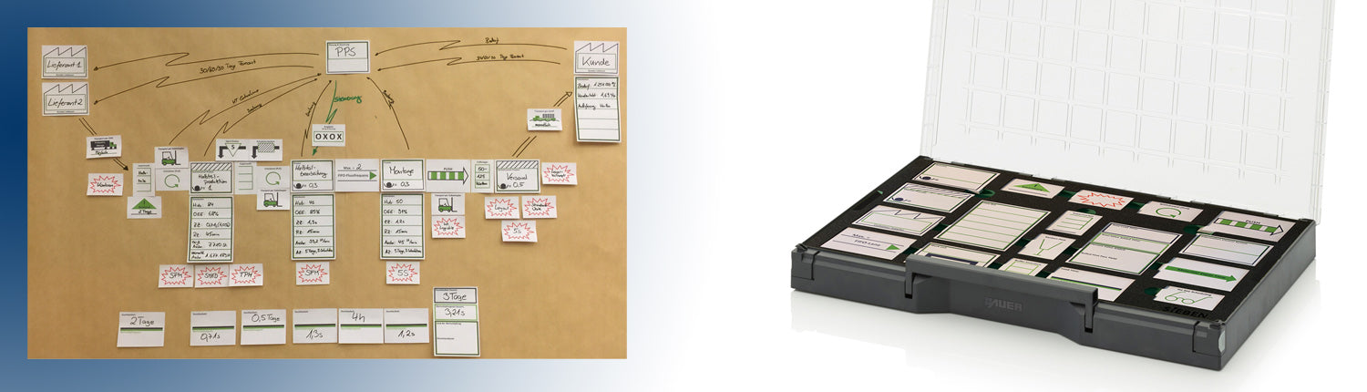 Unsere Koffer wurden für verschiedene Methoden entwickelt. Sie finden beispielsweise Methoden-Koffer für Wertstromanalysen oder die MAKIGAMI-Methode. Inhaltlich sind sie zudem auf die unterschiedlichen Arbeitsumfelder Produktion, Dienstleistung und Administration abgestimmt.