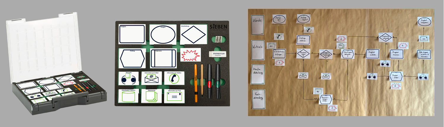 Prozessanalyse-Set für den sofortigen EinsatzAlle Symbole als Haftnotizen für komfortables ArbeitenSymbole mit Bild und Beschriftung fördert Methoden- und Prozessverständnis
